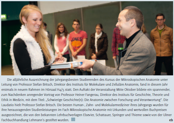 Die besten Human-, Zahn- und Molekularmediziner ihres Jahrgangs werden für herausragende Studienleistungen im Fach Mikroskopische Anatomie mit Urkunden und wertvollen Buchpreisen ausgezeichnet. Die Preise werden von den Lehrbuchverlagen Elsevier, Schattauer, Springer und Thieme sowie der Ulmer Fachbuchhandlung Lehmann's gestiftet.