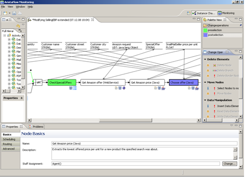 Der AristaFlow Monitor ist für den Systemspezialisten gedacht und ermöglicht unter anderem, die laufenden Prozessinstanzen zu überwachen. Beispielsweise können sich autorisierte Benutzer den aktuellen Zustand oder die Ausführungshistorie einer Prozessinstanz anschauen sowie einen Blick in die Logdatei des zugeordneten Ausführungsdienstes werfen. Darüber hinaus kann der Monitor auch eine aktuell fehlgeschlagene Aktivität zurücksetzen sowie Ad-hoc-Änderungen an einer Prozessinstanz vornehmen. Dabei steht ihm das volle Spektrum an Änderungsoperationen wie bei der Prozessmodellierung zur Verfügung. So wurde die in Abb. 1 als fehlgeschlagen markierte Aktivität "Get Amazon Offer" zunächst zurückgesetzt und dann zusammen mit der nachfolgenden Aktivität "Get Amazon Price" im Prozessgraph nach hinten verschoben und, wie in Abb. 2 gezeigt, nach der Aktivität "CheckSpecialOffers" platziert. Natürlich wurden auch diese Änderungen systemseitig einer Korrektheitsprüfung unterzogen. (Anmerkung: Der konkrete Ablauf dieser Verschiebeoperation ist wie folgt: (1) Markierung des zu verschiebenden Blocks durch Markierung der entsprechenden Knoten. (2) Auswahl (der jetzt freigeschalteten) Operation 'Select Nodes to Move'. (3) Markierung der Einfügestelle: 'CheckSpecialOffers' (grün) und 'Choose offer' (blau). (4) Auswahl der jetzt freigeschalteten Operation 'Move Nodes'. – Fertig!)