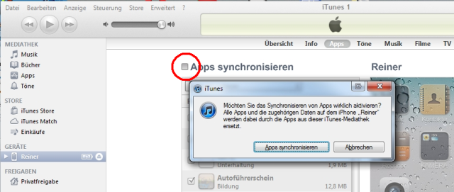 Damit alle Inhalte wie gewohnt auf dem iPhone zu finden sind, ist eine neue Synchronisation notwendig. Es können Apps, Töne, Musik, Filme, TV, Podcasts, Bücher und Fotos synchronisiert werden. Bei jeder Sparte sind die gewünschten Optionen einzustellen. Die Übertragung aller Apps dauert einige Zeit, bitte haben Sie Geduld. Die eventuell vorher zusammengestellten Ordner werden nicht wieder hergestellt.