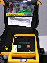 ![]() | Ebenfalls immer dabei ein automatischer externer Defibrillator (AED). Zur Behebung von Kammer-flimmern bei Kreislaufstillstand. In den ersten Minuten sehr Entscheidend über den Erfolg einer Reanimation. So steigen die Chancen über den Erfolg um mehr als 50% | |