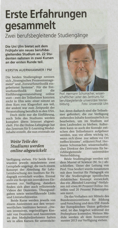 Statt im Hörsaal online lernen: Die Uni Ulm bietet zwei neue berufsbegleitende Studiengänge an. Vorhaben wird mit 2,3 Millionen Euro gefördert (01.08.2012 | Augsburger Allgemeine Online)