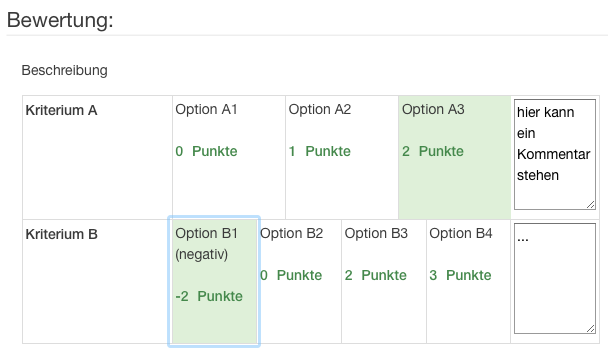 The points of the selected options are added up to a total sum. In the following we will also refer to this as (sum of) criteria points in order to distinguish it from the evaluation points of a task, which will then also be displayed in the course evaluation overview.