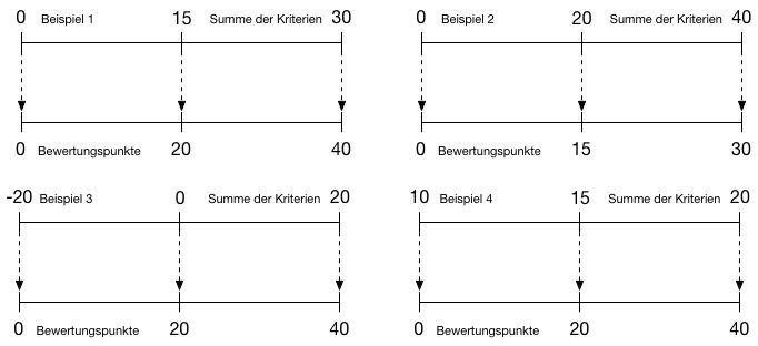 If the minimum achievable sum of criteria points is greater than 0, this type of conversion also has the consequence that the evaluation points are always greater than 0 (see example 4 in figure 6).