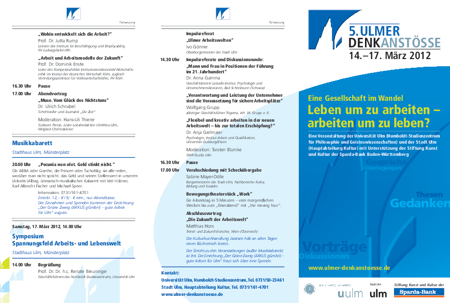 Die 5. Ulmer Denkanstöße sind dem Thema „Leben um zu arbeiten – arbeiten um zu leben? Eine Gesellschaft im Wandel“ gewidmet und finden vom Mittwoch, den 14. bis Samstag, den 17. März 2012 statt.
