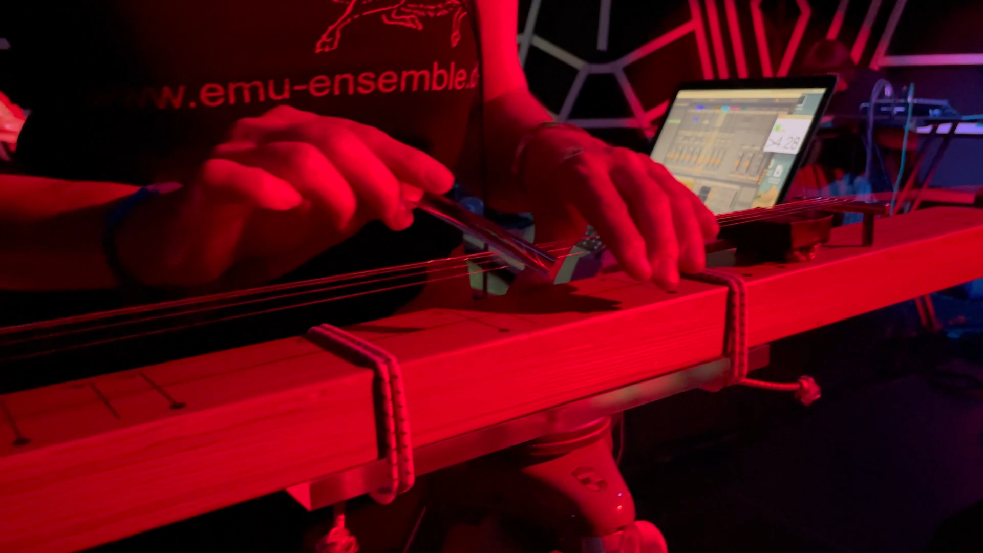 Approach & Distance is a hybrid live performance by the EMU laptop ensemble from Ulm. A performer moves between the stage and the audience and uses two smartphones to generate data streams that are sent both to the ensemble on site and to the fellow performers who are connected via the internet. The signals are transformed into soundscapes and visuals that express the delight of the first encounter, the despair of forced distance and the longing for rapprochement with a second person or another self. The emotionally charged sound of self-made instruments completes the overall acoustic picture of the performance, which can be heard and seen on Saturday evening in the "Heimat" sector.
