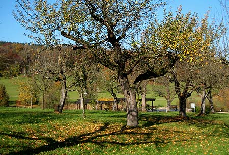 Die Streuobstwiese befindet sich im unteren Freiland in der Nähe des Rosariums und des Bauerngartens.