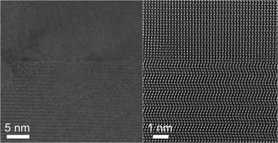 Untersuchungen der atomaren Grenzfläche von 2H-AlN auf 6H-SiC. (links) Übersichtsabbildung. (rechts) Atomar aufgelöste Abbildung der Grenzfläche. Die Doppellagenstruktur von AlN und SiC sind erkennbar (Trennung der Säulen von Al/N-Atomen bzw. Si/C-Atomen), Zusammenarbeit mit Prof. Scholz (Inst. für Optoelektronik)