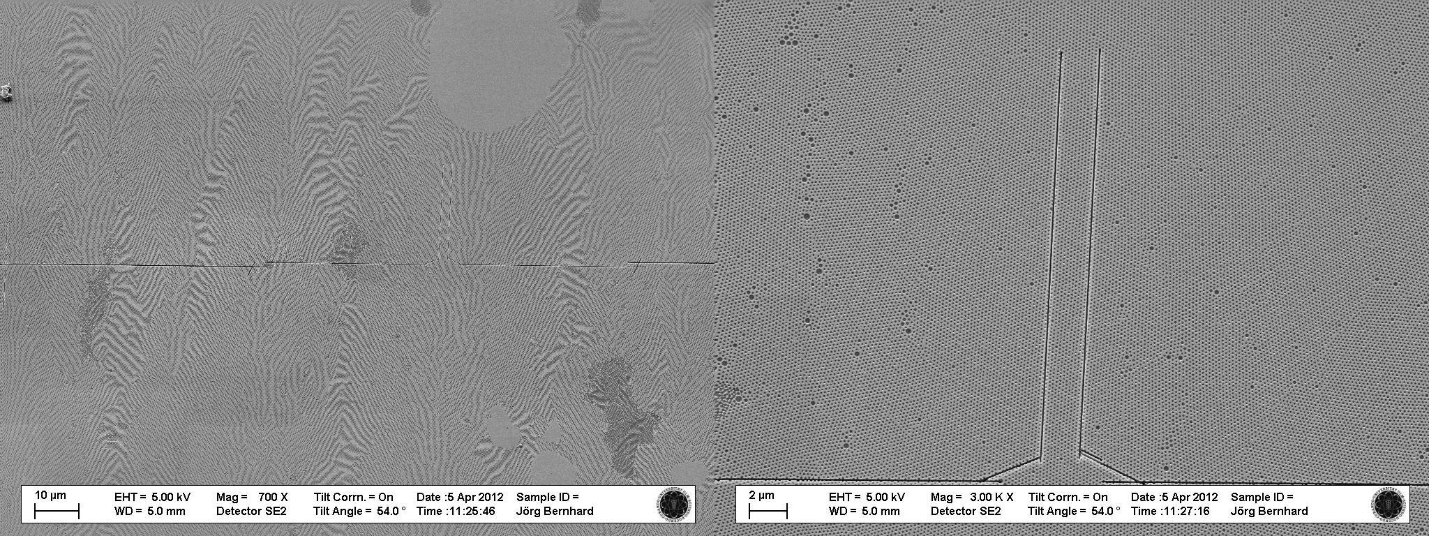 FIB-Strukturierung eines mittels kolloidaler Lithographie hergestellten „Antidot Array“, um später mittels Magnetowiderstands-Messungen das Ummagnetisierungsverhalten lokal zu studieren. Die Auswahl von Bereichen homogener Orientierung der Löcher erfolgt anhand von Interferenzen im Übersichtsbild (links). Servicearbeit für Prof. Ziemann (Institut für Festkörperphysik)