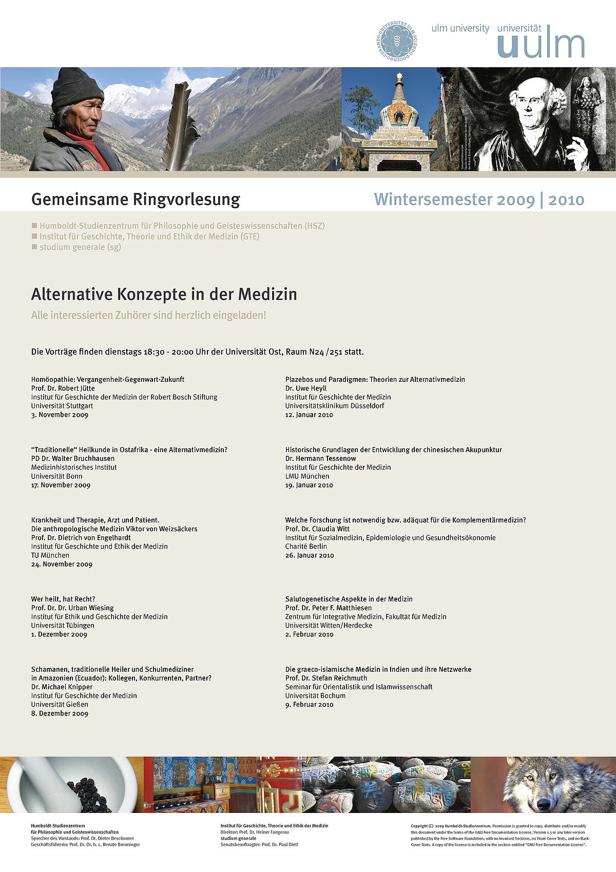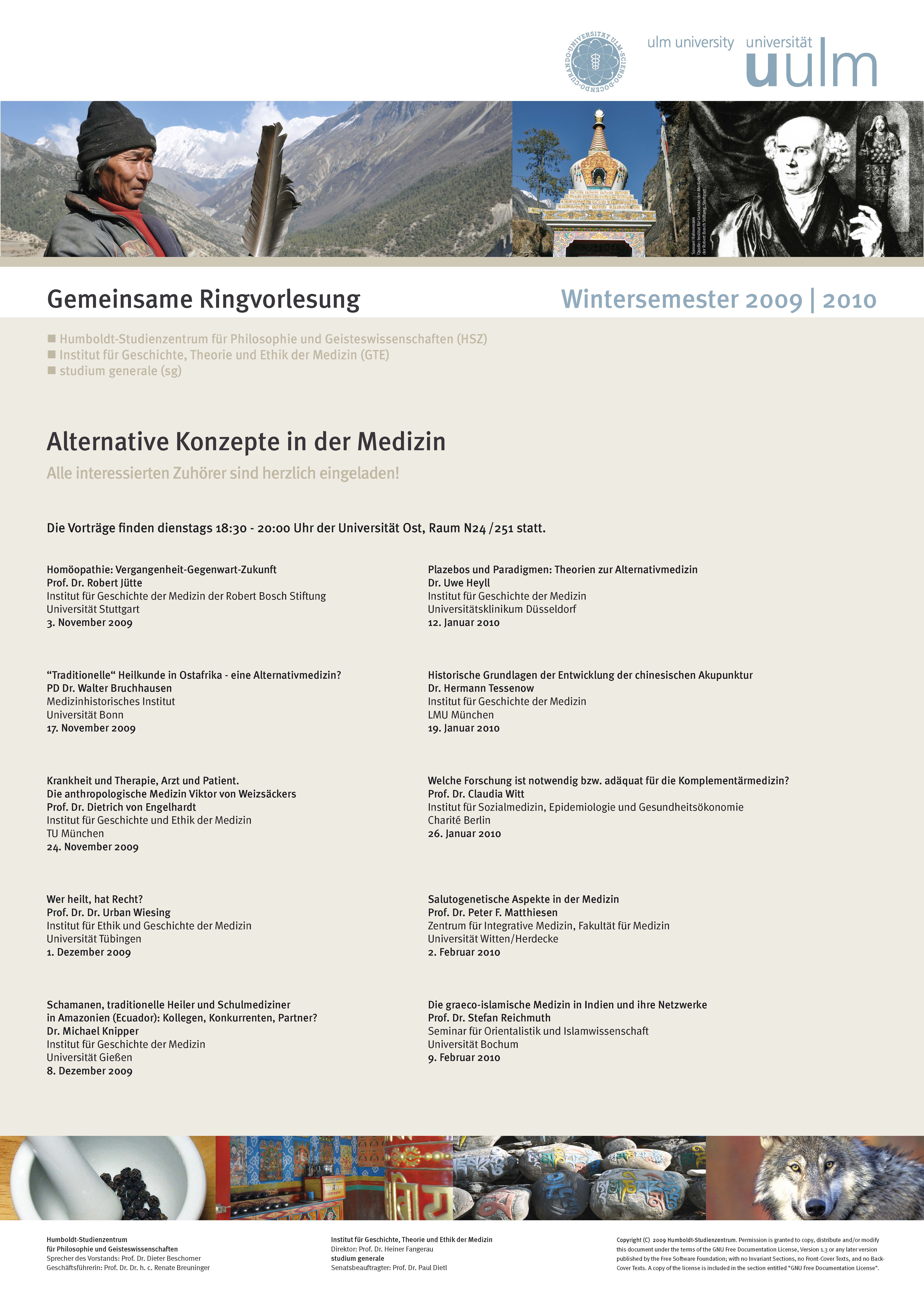 Wir haben dieses Oberthema ausgewählt, weil alternative und teilweise auch exotische Heilverfahren immer wieder und so auch im Moment ihre Konjunktur haben. Diese Vorlesungsreihe möchte verschiedene Ansätze vorstellen und deren Seriosität und ihre Kompatibilität mit der sogenannten Schulmedizin untersuchen.