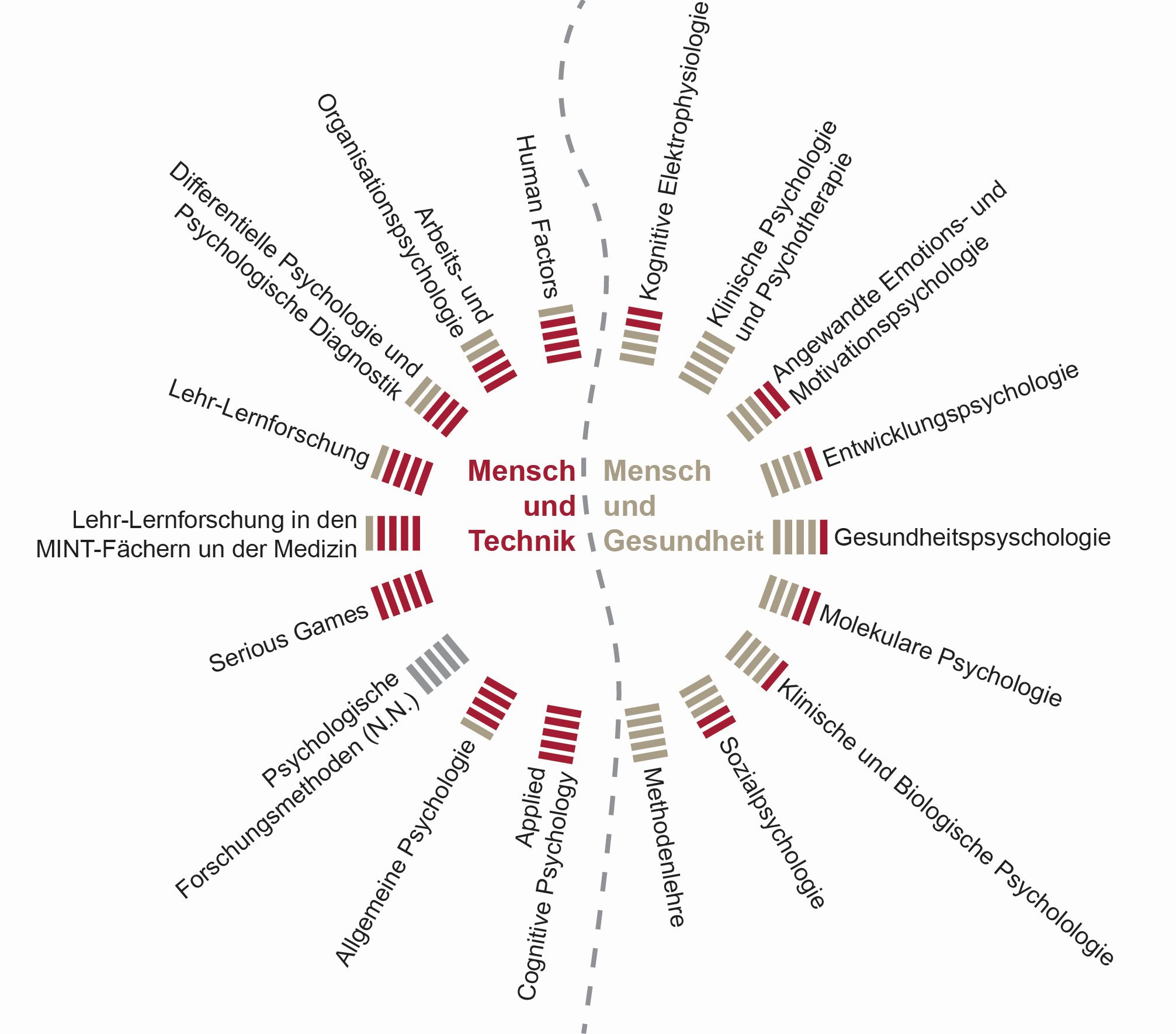 Das wissenschaftliche Profil des Instituts ist im Zuge der Berufungen zunehmend geschärft worden. Die nun eingerichteten Schwerpunkte werden durch die weiteren entstehenden Abteilungen im Jahr 2015 noch gestärkt werden. Die beiden großen Schwerpunkte unserer Forschung liegen in den Bereichen Mensch und Technik sowie Mensch und Gesundheit. In beiden Schwerpunkten arbeiten mehrere Abteilungen an methodischen Fragen, wie der Weiterentwicklung statistischer Prozeduren und der Entwicklung und Validierung von Messinstrumenten. Im Vordergrund der Arbeit steht die Klärung inhaltlicher Fragen – in der Mehrzahl der Forschungsprojekte unter Verwendung anspruchsvoller Laborausstattung. In den folgenden Abschnitten sollen die beiden Forschungsschwerpunkte einleitend vorgestellt werden. Im Schwerpunkt „Mensch und Technik“ ist neben der Klärung genuin psychologischer Fragestellungen eine Intensivierung der bereits gut laufenden und belastbaren Kooperation innerhalb der Fakultät für Informatik und Ingenieurwissenschaften als wichtiges Ziel zu nennen. Im Bereich „Mensch und Gesundheit“ werden in mehreren Projekten Determinanten und Konsequenzen der Gesundheit, Aspekte der Veränderung von Gesundheit und die Grundlagen psychischer Störungen erforscht. Hier existieren bereits vielfältige Kooperationen mit der Fakultät für Medizin die wir in den kommenden Jahren noch klar verstärken wollen. Die Reflektion dieser Forschungsschwerpunkte in der wissenschaftlichen Ausbildung ist uns ein besonderes Anliegen. Die Profile der Masterausbildung im Fach Psychologie sowie unsere Beteiligung am M.Sc. Studiengang Cognitive Systems unterstreichen dies. Wir sind der Überzeugung, dass Expertise in diesen Schwerpunkten unseren Studierenden gute Beschäftigungschancen eröffnen.