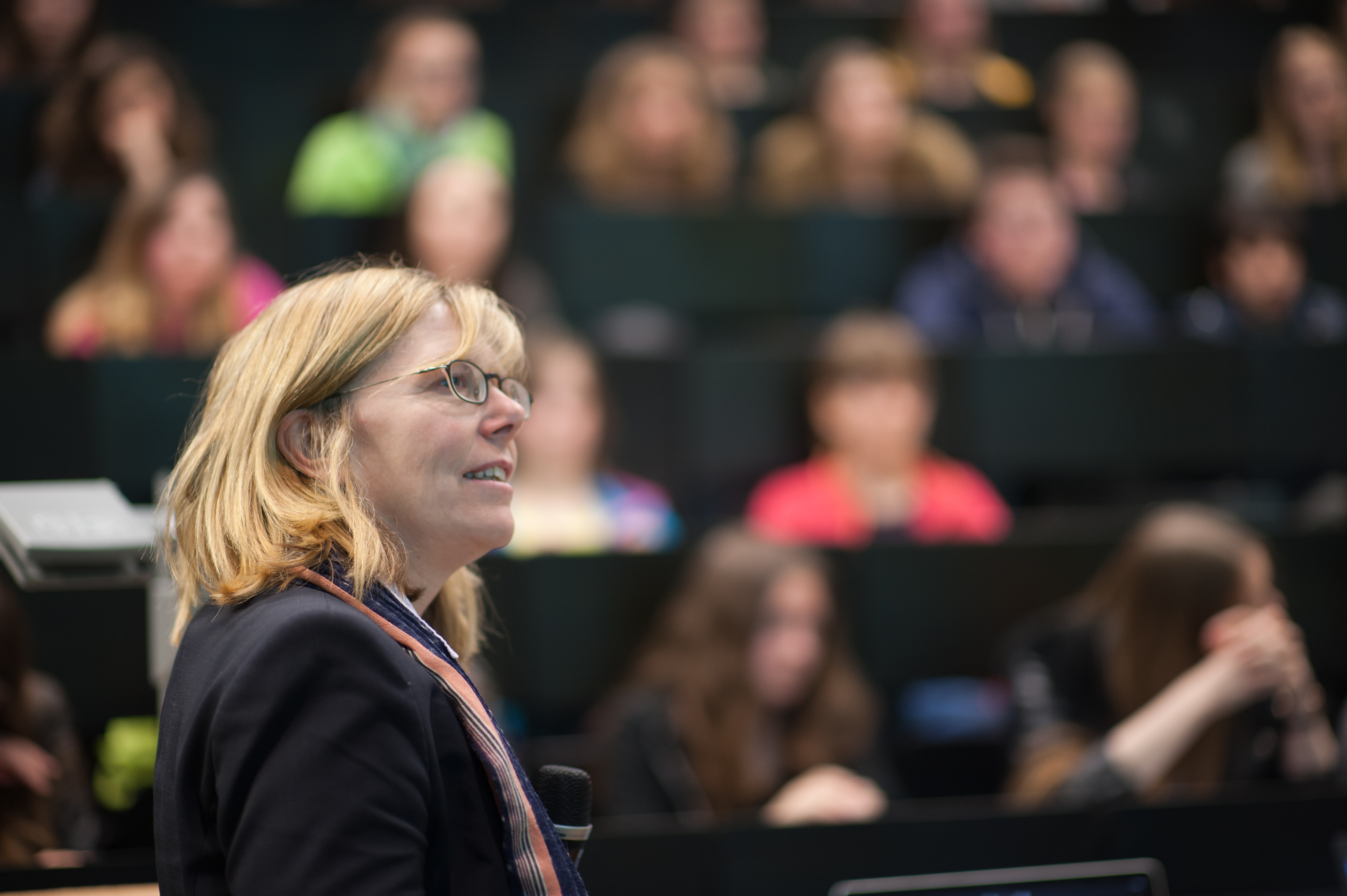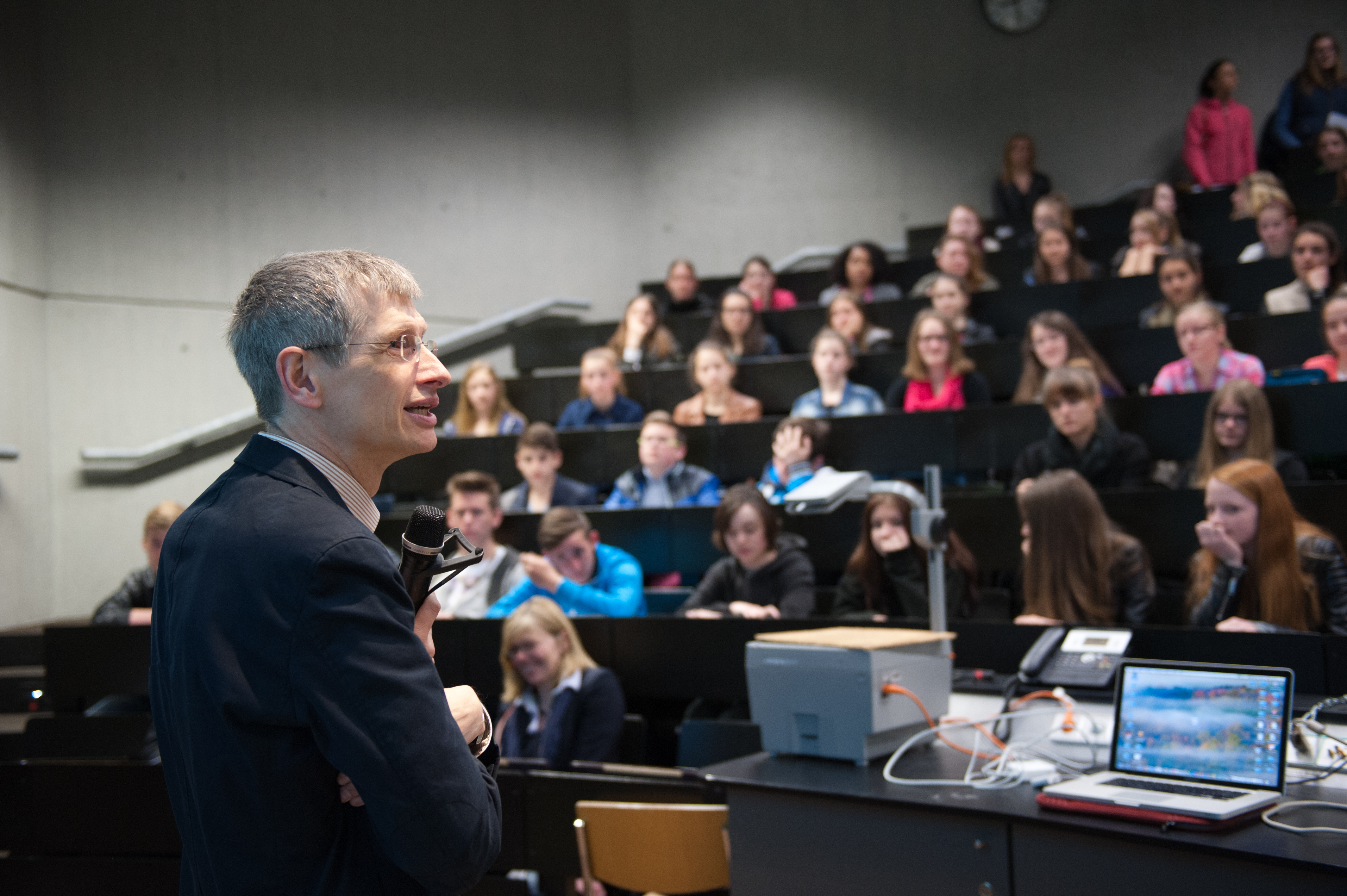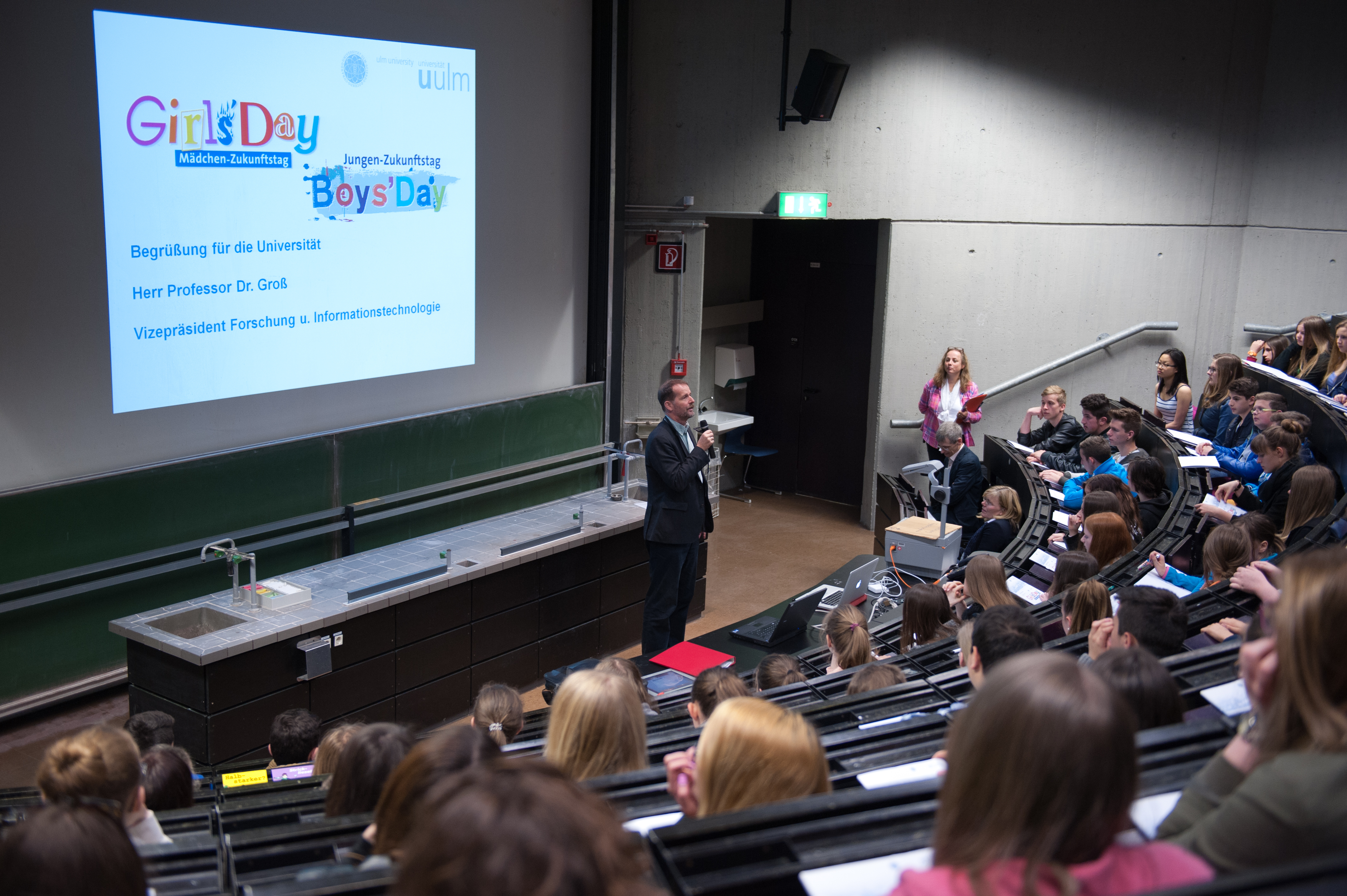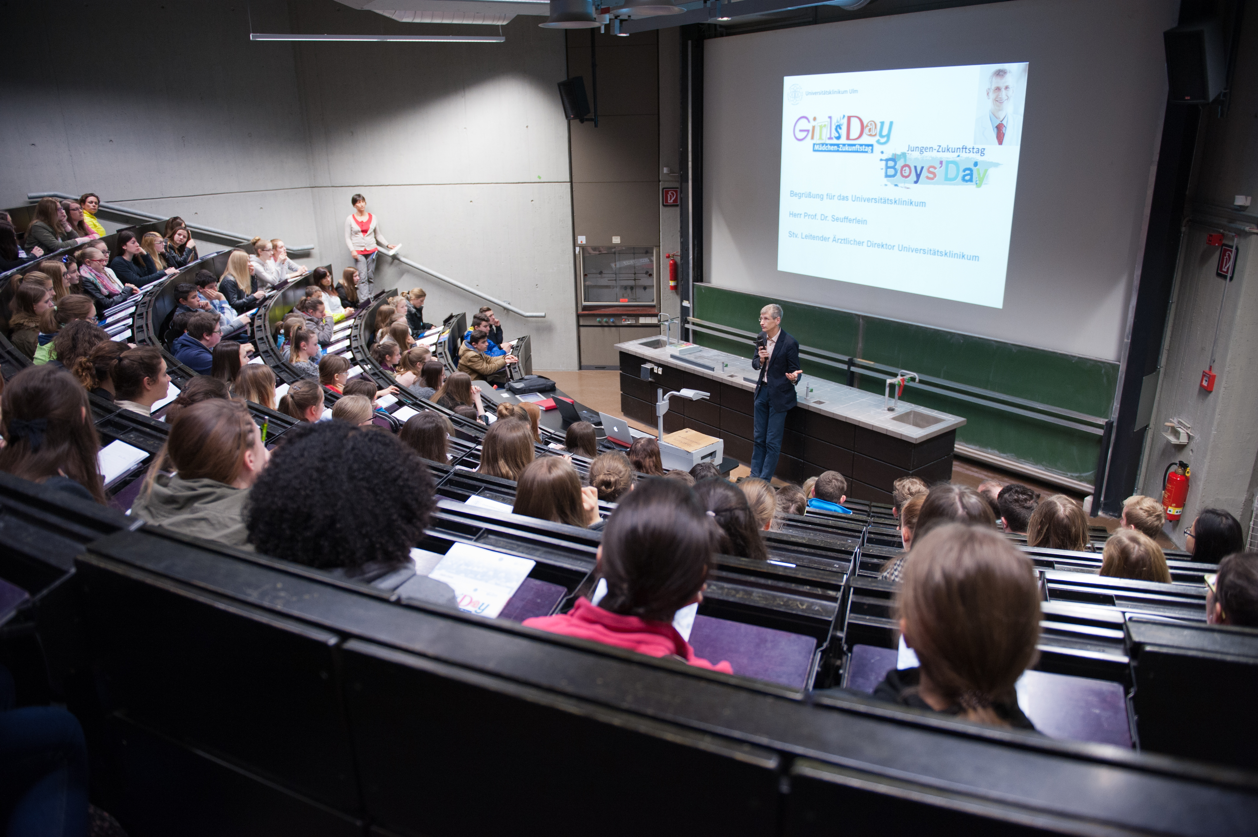 Zur Eröffnung sprachen Prof. Dr. Thomas Seufferlein, stellvertretender Leitender Ärztlicher Direktor des Universitätsklinikums Ulm und Prof. Dr. Axel Groß, Vizepräsident für Forschung und Informationstechnologie der Universität Ulm. Frau Prof. Dr. Barbara Spellerberg ermutigte in ihrer Funktion als stellvertretende Gleichstellungsbeauftragte nicht nur die anwesenden Mädchen, sich für die MINT-Berufe begeistern zu lassen, sondern begrüßte es ausdrücklich, dass sich die Jungen für neue Ausbildungswege interessierten. In ihrem Vortrag „Die halbe Welt den Frauen“ ging es nicht nur um Zahlen und Fakten, sondern auch um die Frage, wie ein Berufsleben mit Glück, Familie und Erfolg gelingen kann.
