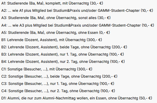Studentische Mitglieder bei Studium & Praxis e.V. (SuP) und/oder im GAMM-Students-Chapter zahlen nur 10,- € für die volle Leistung. Diese Mitgliedschaften müssen uns erst zu Beginn des Workshops nachgewiesen werden, können also auch noch jetzt schnell beantragt werden! - Dozenten, Gäste, Alumni zahlen pauschal 300,- € für die volle Leistung. Wer aus dieser Gruppe nicht übernachten will und/oder nur an einem Tag teilnehmen will, zahlt einen reduzierten Preis. Details dazu: 100,- € für einen und 200,- € für beide Tage, je ohne Übernachtung. Pro Tag enthalten sind Mittag- und Abendessen.