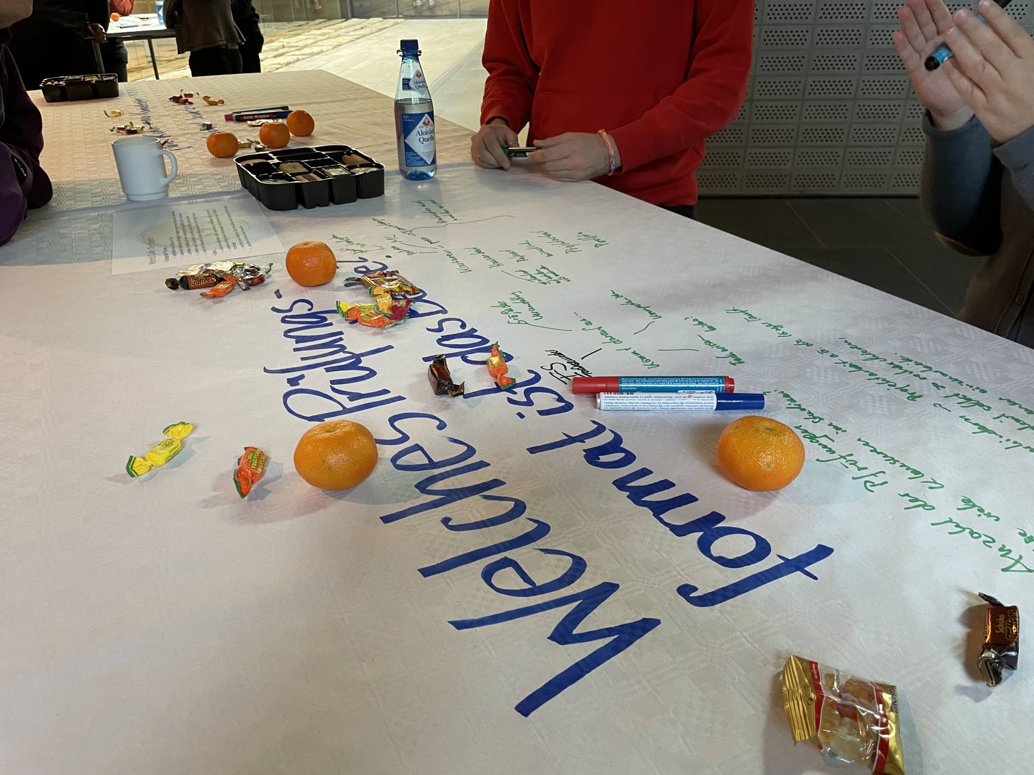 Für Teilnehmende in Präsenz: Moderator*innen an den Thementischen notierten Ihre Diskussionsbeiträge direkt auf die "Tischdecke" und stellten im Plenum eine Zusammenfassung vor. Natürlich durften auch die Teilnehmenden selbst zu den Stiften greifen.