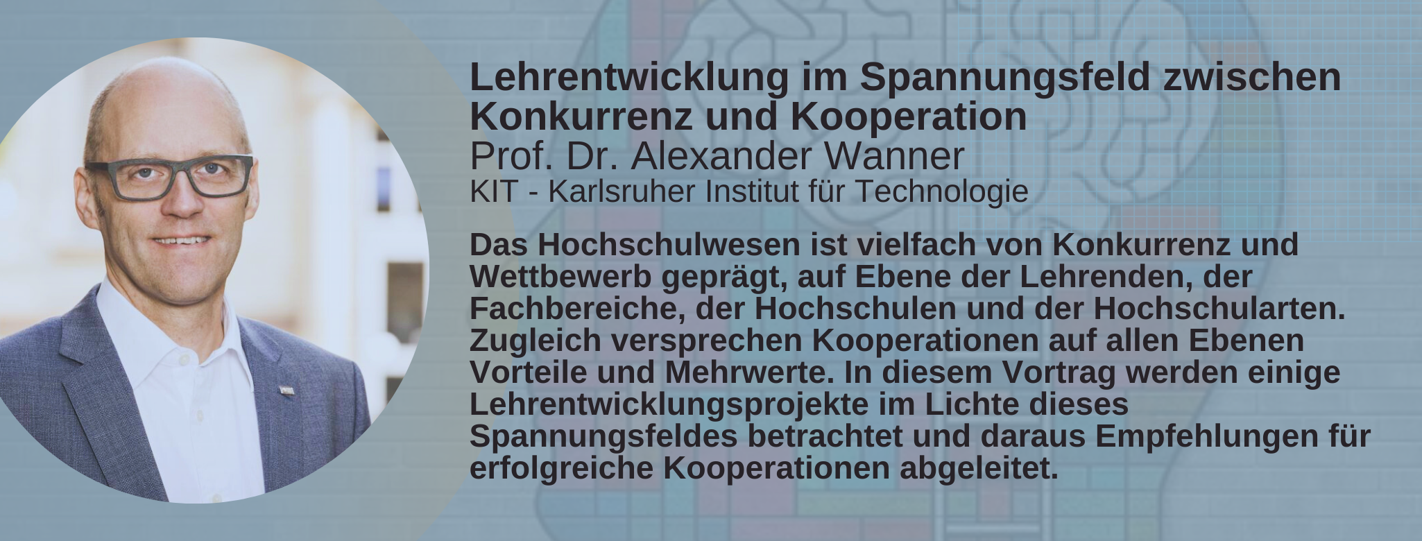 Wir freuen uns, dass wir für den Keynote-Vortrag Prof. Dr. Alexander Wanner gewinnen konnten. Prof. Dr. Wanner hat als langjähriger Vizepräsident für Lehre und akademische Angelegenheiten am Karlsruher Institut für Technologie (KIT) die Hochschullehre in Baden-Württemberg und darüber hinaus maßgeblich geprägt. Ein besonderer Schwerpunkt seiner Arbeit lag auf der Förderung von Kooperationen in der Lehre: Er war eine treibende Kraft beim Aufbau und der Weiterentwicklung des Hochschulnetzwerks Digitalisierung Baden-Württemberg (HND-BW) und setzte sich für die hochschulübergreifende Zusammenarbeit in nationalen und internationalen Verbünden wie TU9, EUCOR und EPICUR ein. Unter seiner Verantwortung wurden am KIT zentrale Initiativen zur Qualitätssicherung, zur Lehrkräftebildung und zur forschungsorientierten Lehre angestoßen und umgesetzt – stets mit dem Ziel, Lehre im Austausch und in enger Zusammenarbeit gemeinsam weiterzuentwickeln.