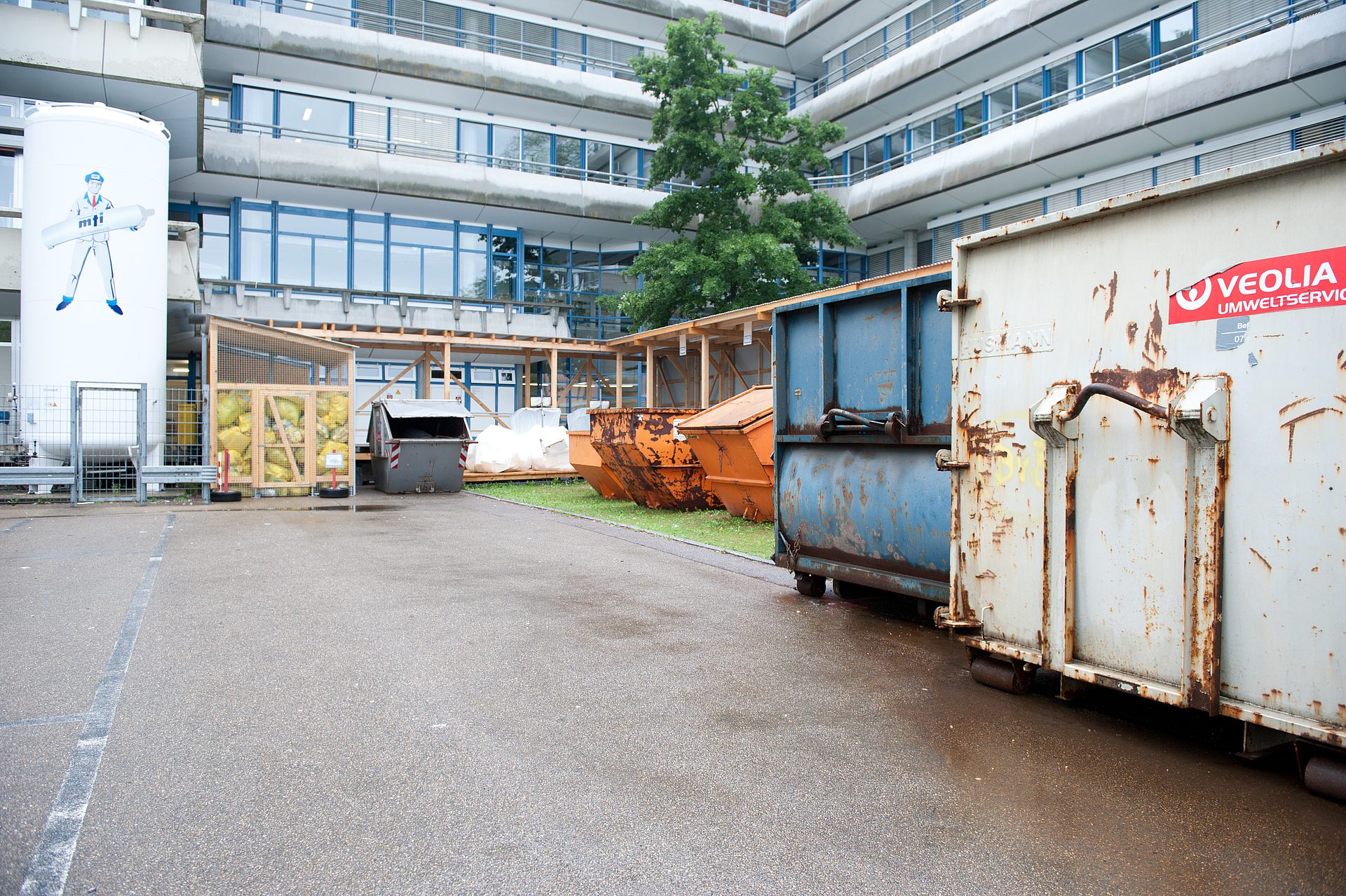 Im Betriebshof A der Universität Ost stehen Container für Papier, Glas, Holz, Aluminium-, und Eisenschrott sowie Restmüll zur Verfügung.