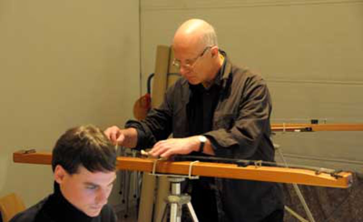 Dieter Trüstedt im Musiklabor - vor dem Transport der Lautsprecher, Stative, Kabel, Beamer, Laptops, Chins (ab)