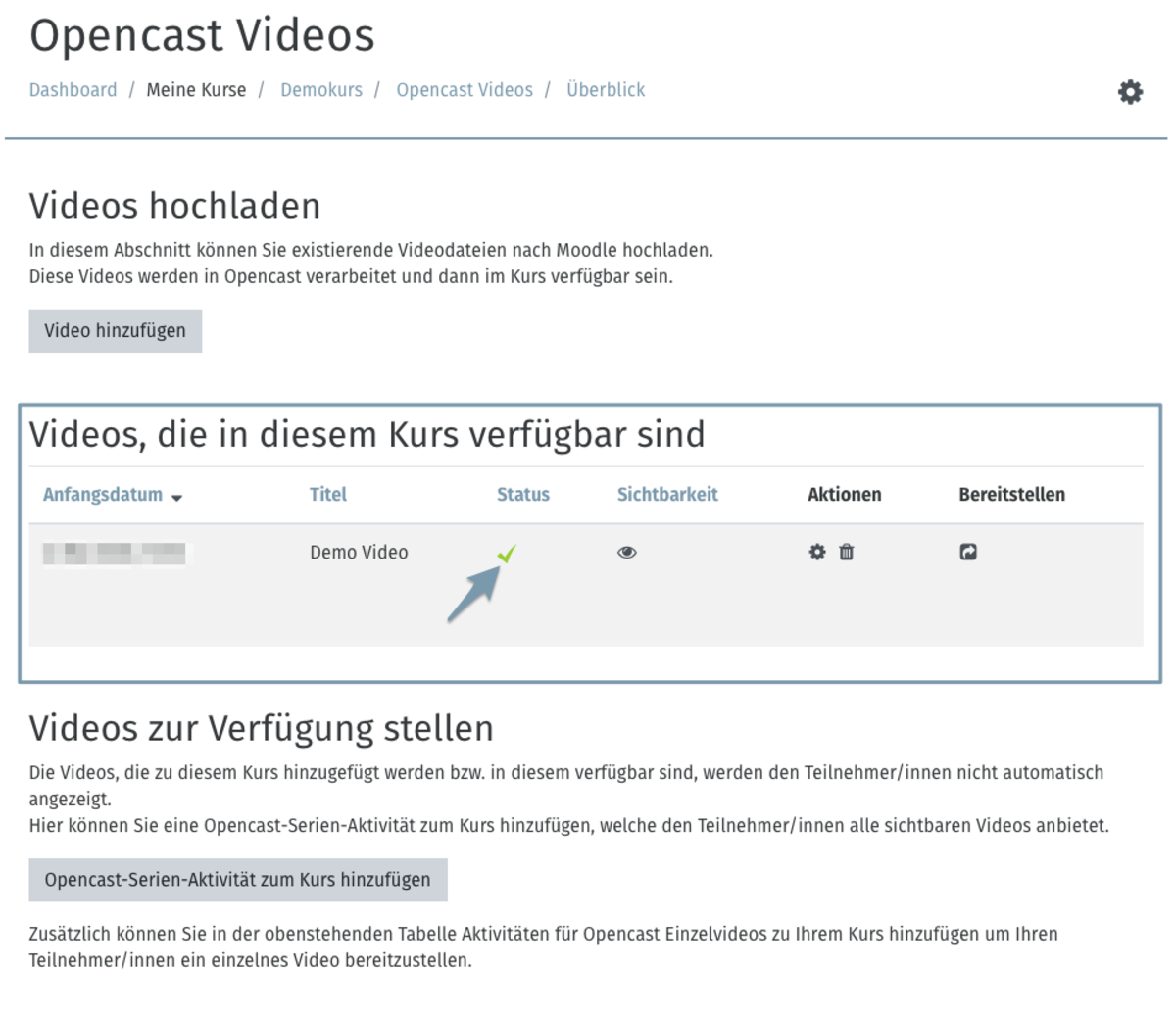 Möchten Sie nun ein Video aus Opencast einzeln im Kurs platzieren, dann klicken Sie in der Spalte Bereitstellen auf das entsprechende Icon mit dem Pfeil (Abb. 15). Sie gelangen dann auf eine neue Seite (Abb. 16), die genauso aufgebaut ist, wie die beim Hinzufügen der ganzen Serienaktivität.