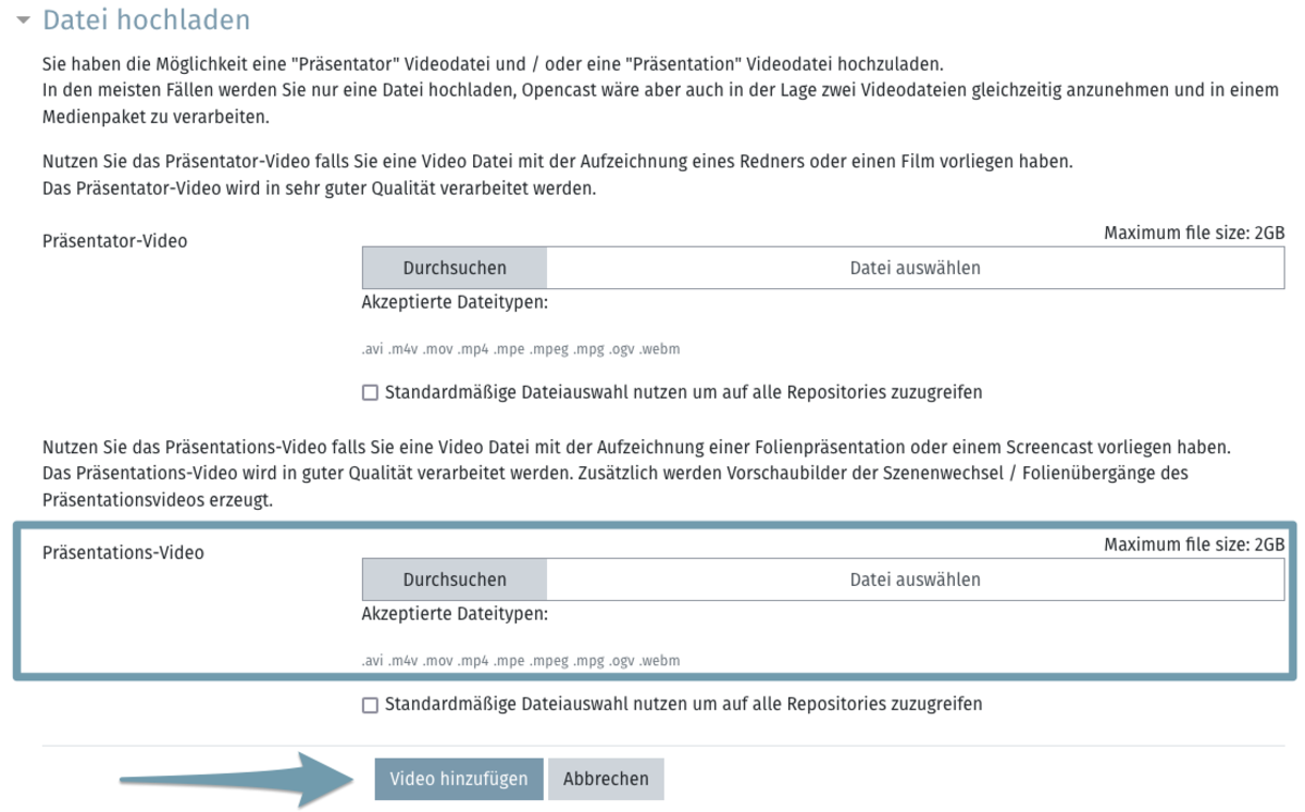 In unserem Beispiel vergeben wir auch für dieses Video eine Beschreibung und platzieren es dieses mal nicht im Abschnitt Allgemeines, sondern im Abschnitt Videos.