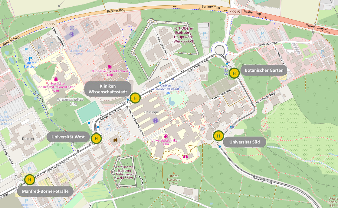 You can also enter the bus/train stop "Universität Süd" here; of course, you can also enter any of the other 5 public transport stops on campus. Since the names of the stops also occur in other cities, you should add ", Ulm" to the stop name.