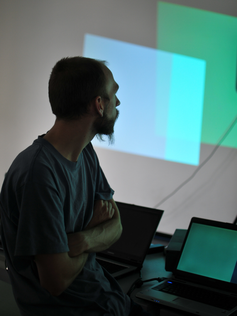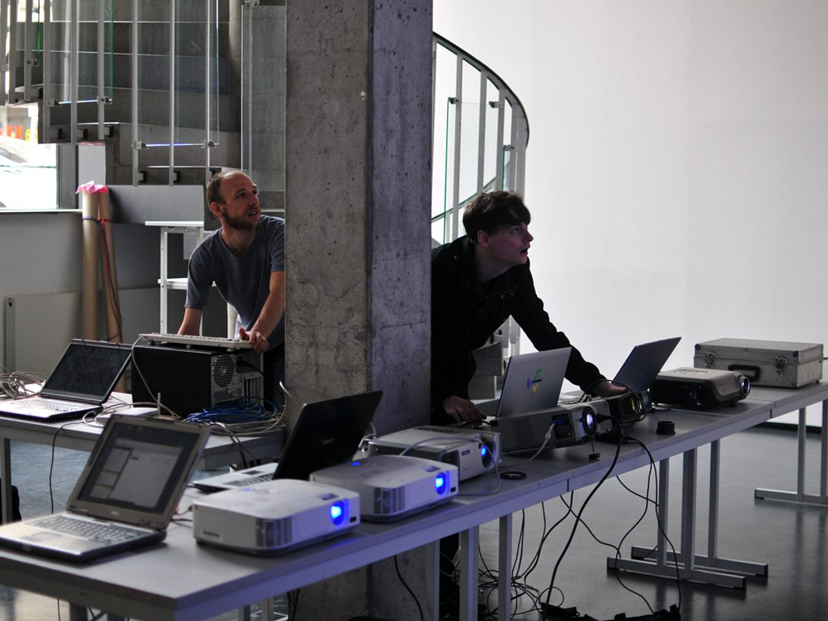 Andhi Pabst hatte schon für das Kandinsky-Projekt Nr. 2 mit vvvv ein Programm entwickelt, das sowohl fertige Flashfilme auf die Projektoren verteilen und synchron halten konnte als auch dynamische Animationen.