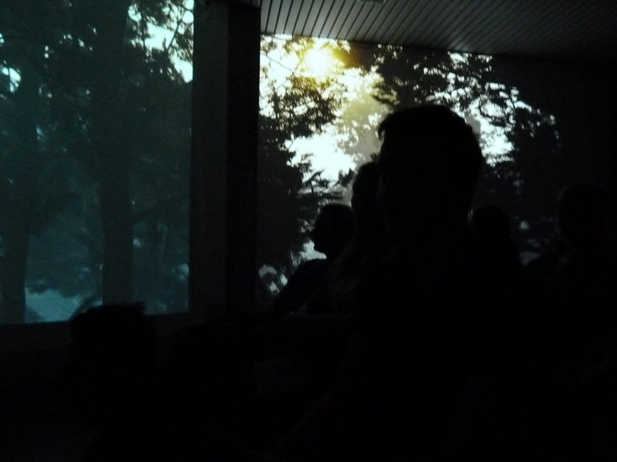 Die Projektionen reichten vom Fußboden bis zur Decke. Für die diagonale Wand (Projektion 5) nähte Klaus eine Leinwand, die wir mittels Holzlattenkonstruktion über Eck im Raum befestigten.