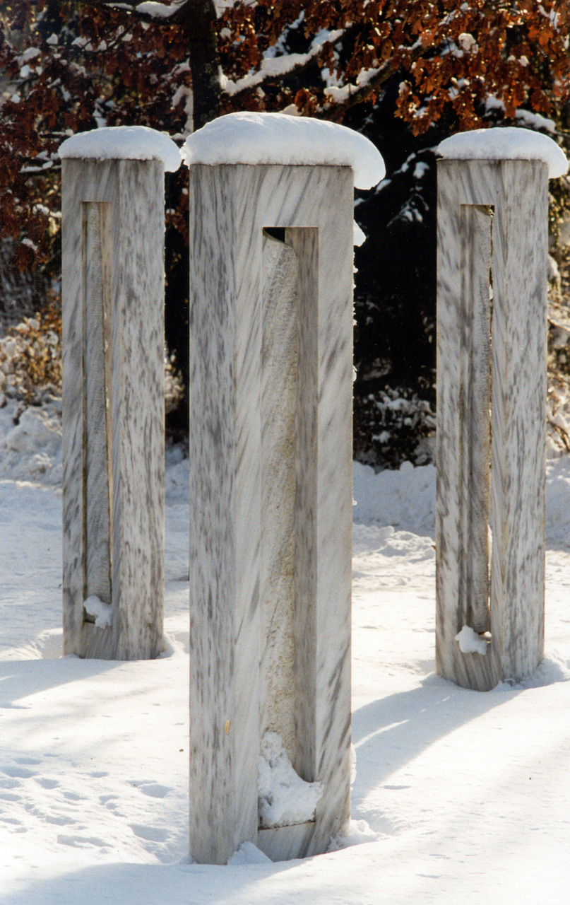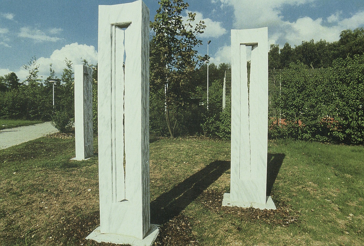 Die drei Stelen bergen ein Stück Restnatur in einem strengen, geometrischen Rahmen. Die Innenform sitzt bruchstückhaft rauh im Rahmen und kontrastiert zu dessen geschliffener Oberfläche. Das durchbrechende Licht akzentuiert die fragile Wirkung der in Auflösung begriffenen Innenform. Die Arbeiten sind drei Variationen zu einer Formauflösung, wobei der Stein, als Zeichen für gewachsene Natur, bis zu seiner Zerbrechlichkeit ausgedünnt wird Jedoch hat diese Auflösung keinen destruktiven Charakter, sondern führt zu einem neuen Seherlebnis Der Innenraum wird zum Spielraum des Lichts. Seine Wirkung verändert sich stetig mit fortschreitender Zeit.