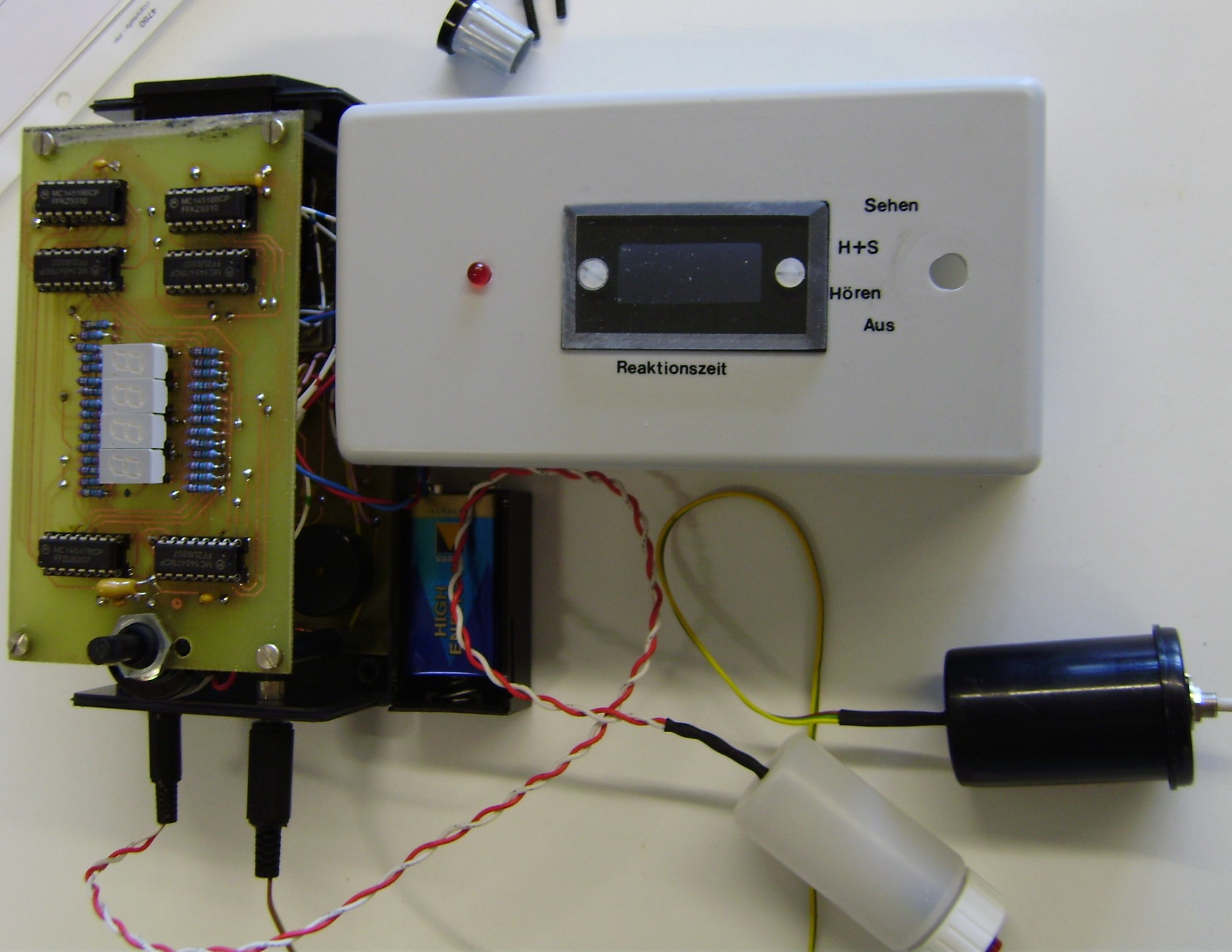 After a random waiting time between 0 and 30 seconds the signal appears, the reaction time is then shown in ms on the 7-segment display.