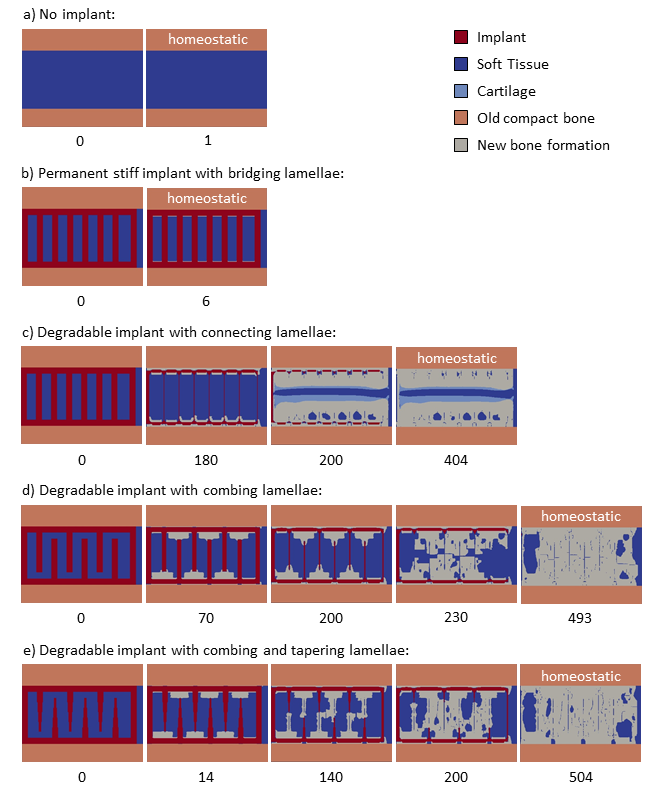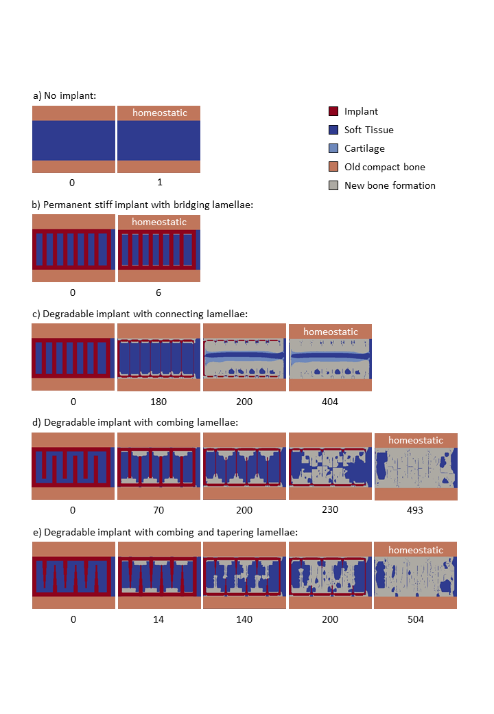 The first very promising simulation results of this model for five different cases of rotationally symmetrical (the axis of symmetry is on the left edge of the healing area) fusion implants made of a resorbable material can be seen in the picture (right). An axial load is transferred from the upper to the lower bone plate via the implant and leads to different straining and thus different stimulation of cartilage and bone growth. The model shows that a successful bone fusion depends very much on the degradation kinetik and the design of the cages mikrostructure. In any case, the model impressively shows the potential as a valuable tool for developing and optimizing degradable bone implants.
