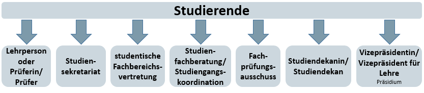 Studierende sollten zunächst Kontakt mit den unmittelbar beteiligten Lehrpersonen bzw. Prüfenden aufnehmen.