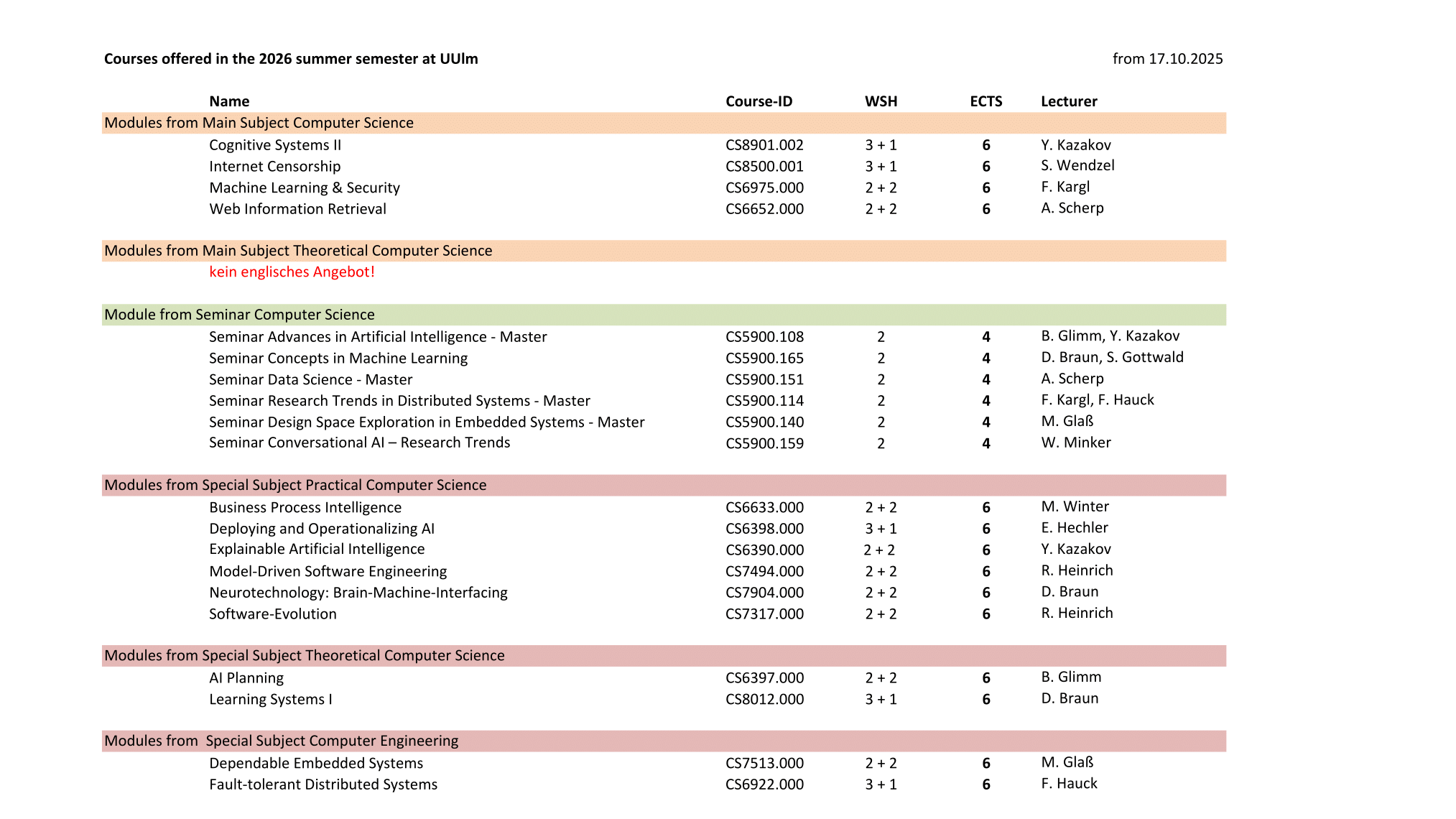 Studienplan Vorlesungsangebot Anerkennung von Leistungen
