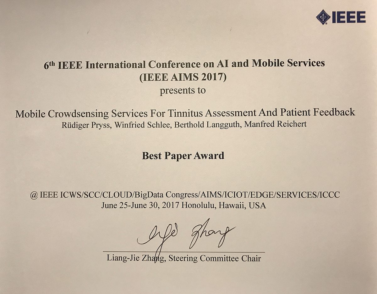 <link in iui-dbis mitarbeiter mitarbeiteruebersicht ruediger-pryss internal link current>Rüdiger Pryss, Winfried Schlee, Berthold Langguth and <link in iui-dbis mitarbeiter mitarbeiteruebersicht manfred-reichert internal link current>Manfred Reichert received the Best Paper Award at 6th IEEE International Conference on AI & Mobile Services (IEEE AIMS 2017)for their paper entitled "Mobile Crowdsensing Services for Tinnituts Assessment and Patient Feedback". This work originated from the TrackYourTinnitus project.