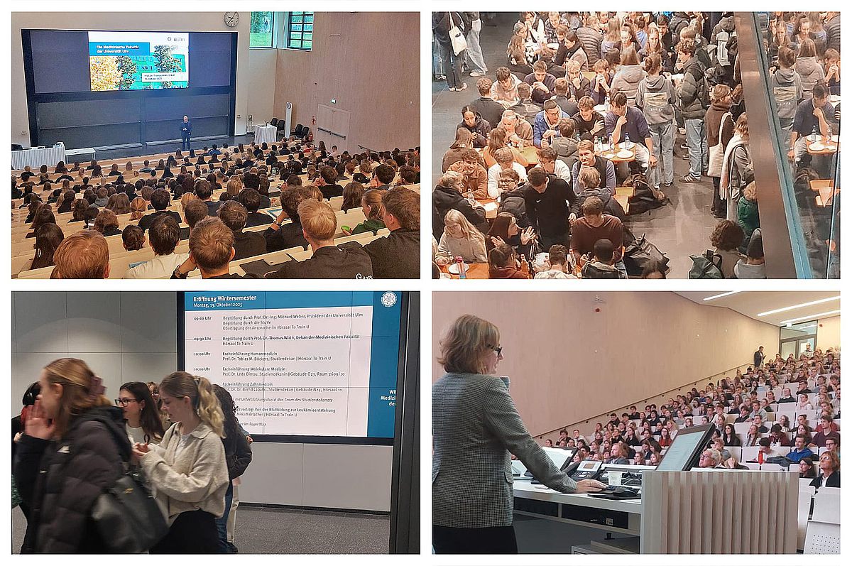Das Wetter war trüb und eher kühl - aber die Stimmung ganz besonders! Der Zauber des Anfangs lag in der Luft dieser offiziellen Eröffnung zum Wintersemester 2025/2026. Dekan Prof. Dr. Thomas Wirth begrüßte die Erstsemester im absolut voll besetzten großen Hörsaal des Trainingshospitals To Train U. Anschließend übernahmen die Studiendekane Prof. Dr. Tobias M. Böckers, Prof. Dr. Leda Dimou und Prof. Dr. Bernd Lapatki die Einführungen für die Studierenden der Humanmedizin, der Molekularen Medizin und der Zahnmedizin. Das volle Programm bis zum Nachmittag hielten alle Erstis locker durch. Der diesjährige Vortrag von Prof. Dr. Miriam Erlacher, Ärztliche Direktorin der Klinik für Kinder- und Jugendmedizin, stand unter der Überschrift „Von der Blutbildung zur Leukämieentstehung“. Ein Thema, das viele zu persönlichen Fragen animierte, auch im anschließenden Gespräch beim Get Together. Wir wünschen allen einen guten Start in das Wintersemester und weiterhin so viel Energie!