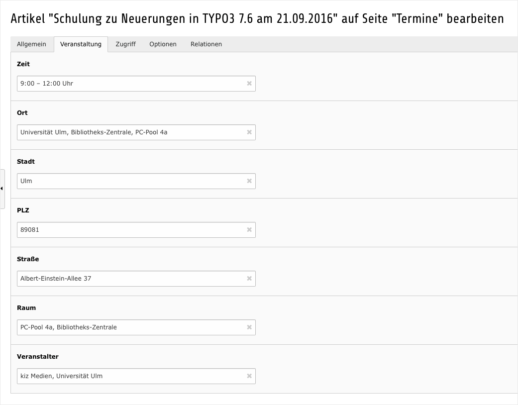 Bild 2: Datenfelder eines Termins im Backend von TYPO3 7.6