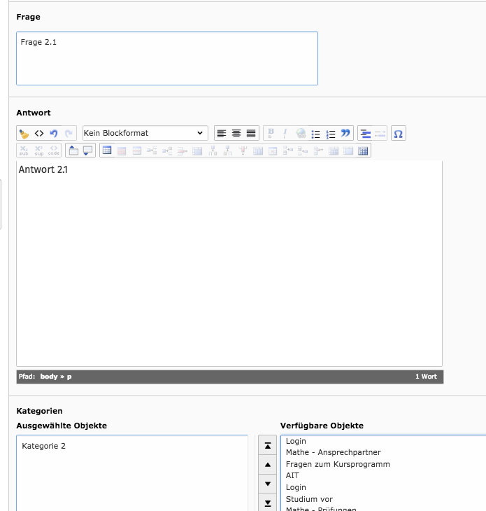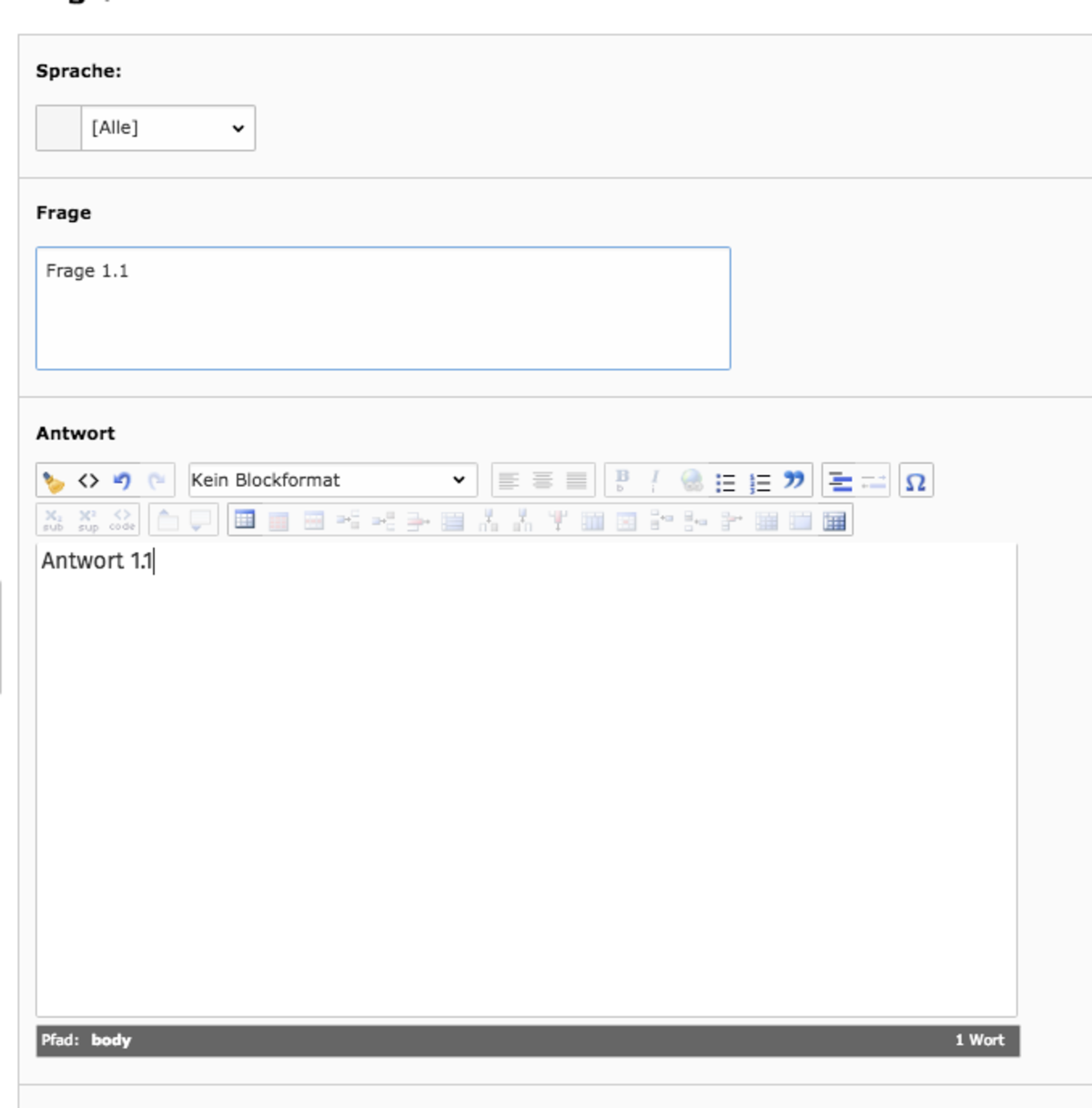 Wenn Sie mehrere Kategorien in einem FAQ-Element auswählen, werden die dazugehörigen Fragen/Antwortpaare untereinander angeordnet. Es ist dabei nicht ersichtlich welche Fragen zu welchen Kategorien gehören. (Beispiel 1)