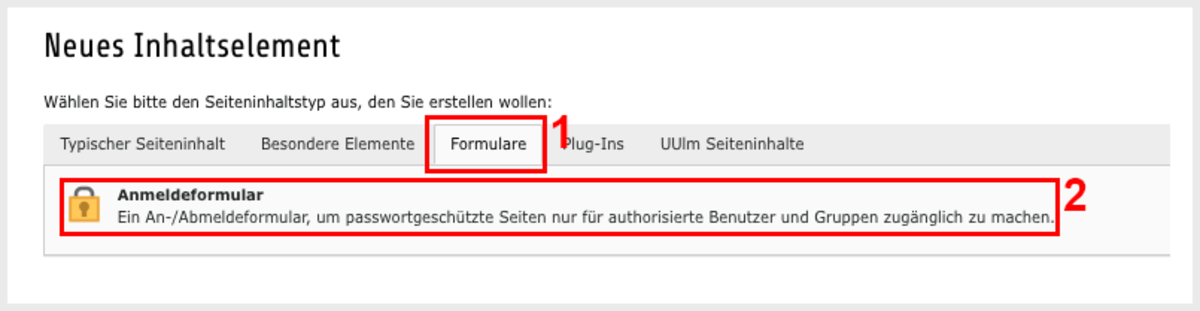 Neues Inhaltselement vom Typ Formulare → Anmeldeformular (Bild 3/Schritt 1 + Bild 3/Schritt 2) wählen.