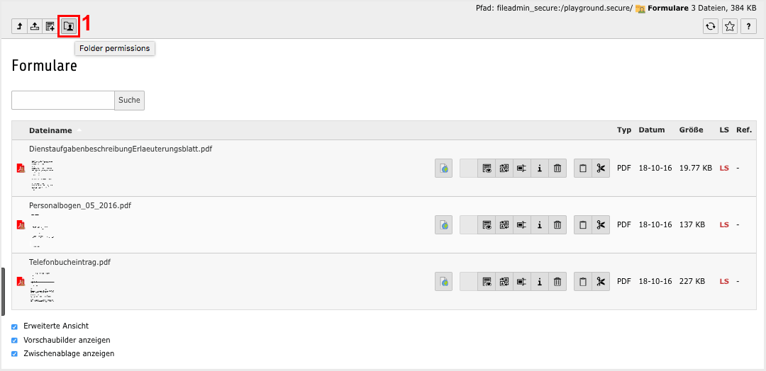 - Um den Zugriff auf einen Ordner zu bearbeiten, die Schaltfläche Folder permissions (Bild 1/Schritt 1) wählen.