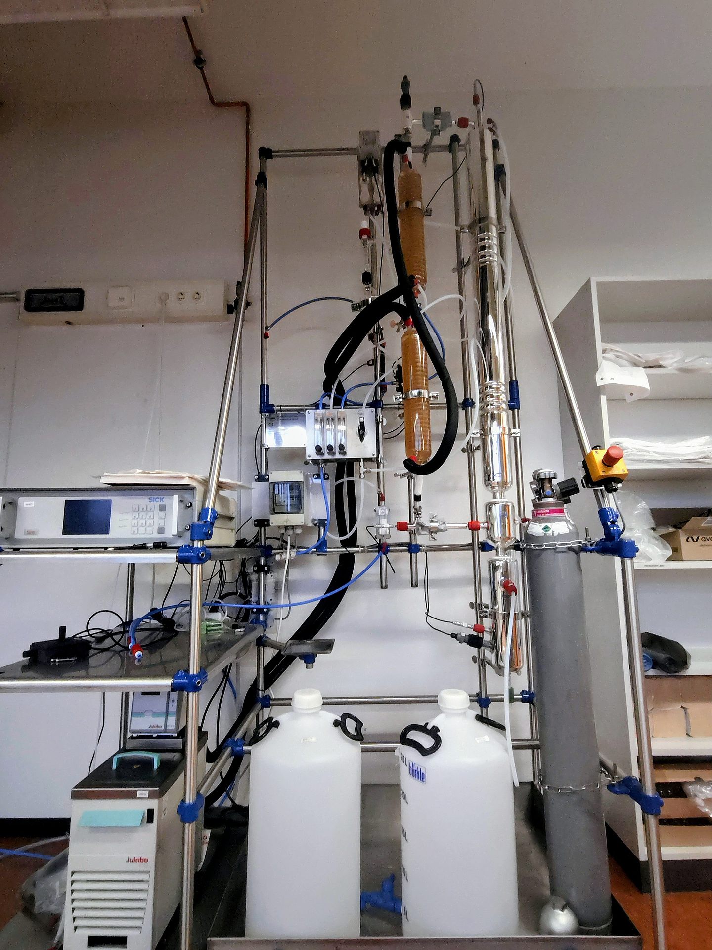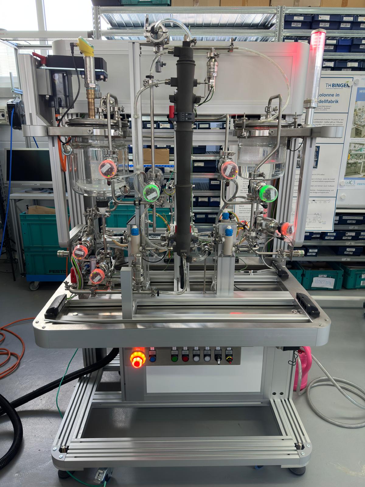 This completely self-designed and built continuous laboratory distillation unit allows the precise determination of pressure and heat losses as well as the separation performance. In contrast to the “Distillation Test Rig I” , it can be operated fully automated continuously with finite refluxes. Fully additively manufactured columns are also used here.