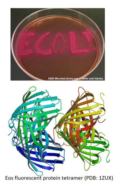 E. coli cells are transformed with a plasmid coding for the photoconvertible fluorescent protein Eos as well as for an antibiotic resistance.