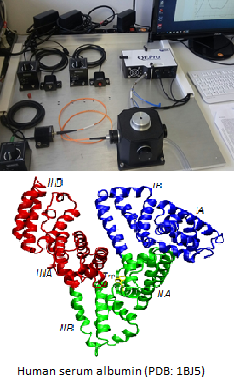 The folding equilibrium of the plasmaprotein HSA (Human Serum Albumin) is characterized from the fluorescence of a tryptophan residue at position 214.