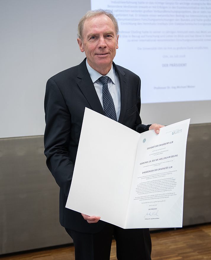 Zur positiven Entwicklung der Uni Ulm maßgeblich beigetragen hat Professor Karl Joachim Ebeling, Universitätspräsident von 2003 bis 2015 und ehemaliger Leiter des Instituts für Optoelektronik. Für seine Verdienste zeichnete ihn sein Nachfolger, Professor Michael Weber, beim Jahrestag mit der Ehrenbürgerwürde aus. „Die Amtszeit von Professor Karl Joachim Ebeling war gekennzeichnet durch einen stetigen Aufwärtstrend und eine fokussierte, strategische Weiterentwicklung der Universität Ulm“, so Weber.