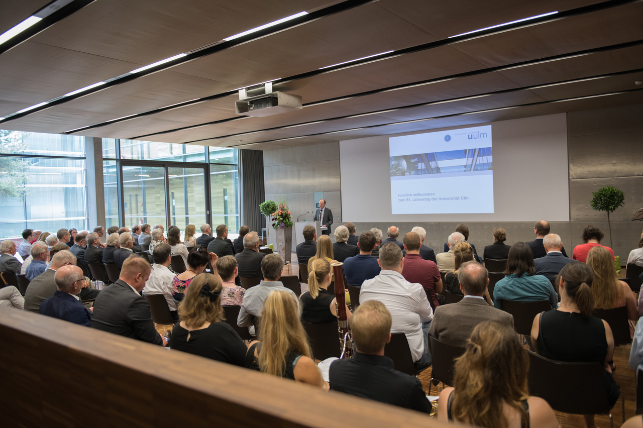 Mit Antrittsvorlesungen, Promotionspreisen und einem Festvortrag des Präsidenten der Helmholtz-Gemeinschaft, Professor Otmar D. Wiestler, hat die Universität Ulm Ende Juli ihren 51. Jahrestag gefeiert. Zu den Höhepunkten des Festakts zählten weiterhin die Verleihung der Ehrenbürgerwürde der Universität Ulm an ihren ehemaligen Präsidenten, Professor Karl Joachim Ebeling, sowie die Auszeichnung von Professor Dieter Kurz, ehemals Vorsitzender des Universitätsrats, als Ehrensenator.