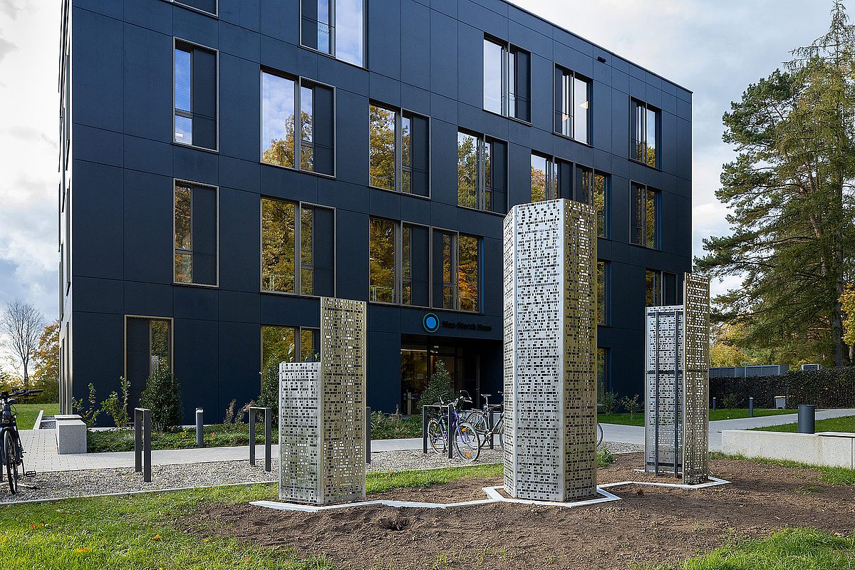 Together with the 60 or so invited guests, the foundation was able to pay Dr Barbara Mez-Starck another honour. A sculpture commemorating the founder and her life's work was unveiled in front of the building at Oberberghof 7 in Ulm. Three columns clad with stainless steel plates represent the work of Dr Barbara Mez-Starck from the 1950s onwards: the Starck catalogue for microwave research, from which the MOGADOC database emerged, which links spectra, molecular structures and literature sources and is still used today.