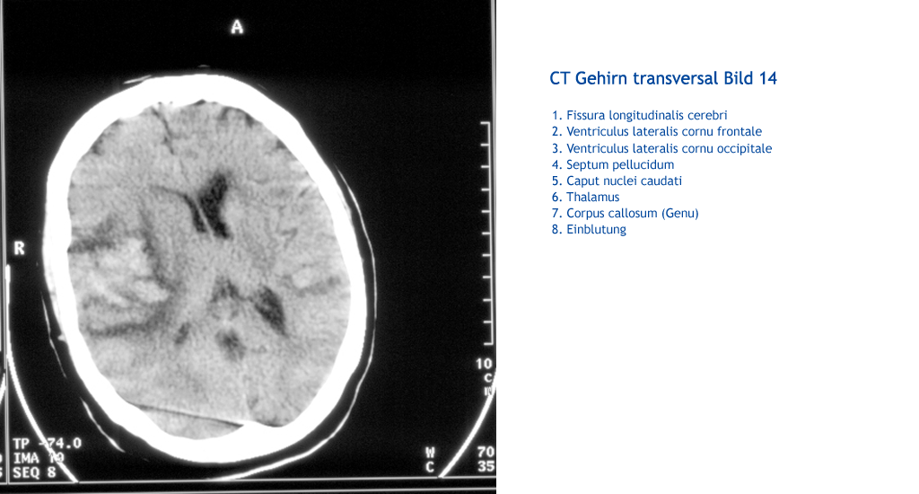 Einblutung Corpus callosum (Genu) Thalamus Caput nuclei caudati Septum pellucidum Ventriculus lateralis cornu occipitale Ventriculus lateralis cornu frontale Fissura longitudinalis cerebri
