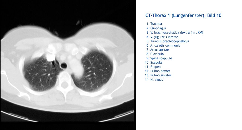 N. vagus Pulmo sinister Pulmo dexter Rippen Rippen Rippen Scapula Spina scapula Clavicula Arcus aortae A. carotis communis Truncus brachiocephalicus V. jugularis interna V. brachiocephalica dextra (mit KM) Ösophagus Trachea