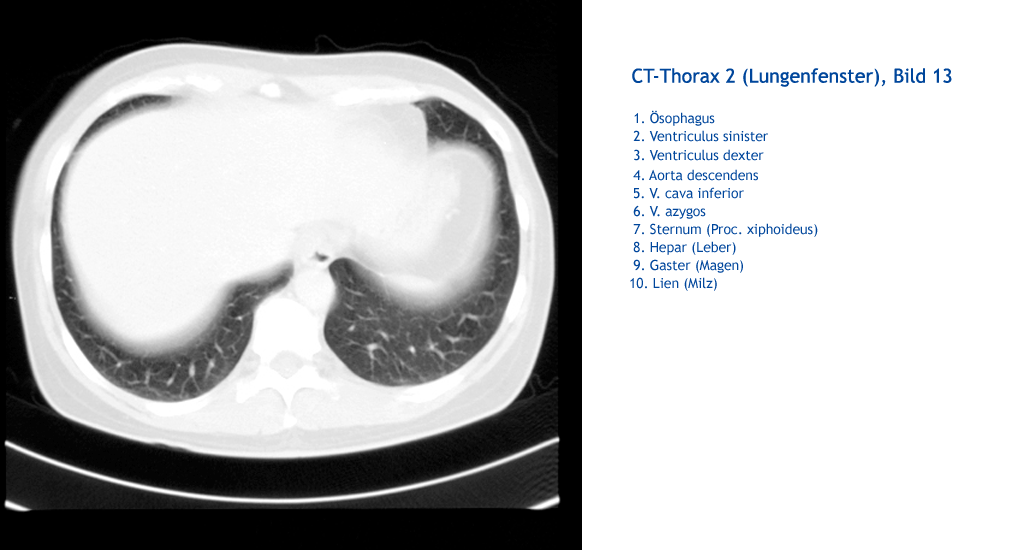 Lien (Milz) Gaster (Magen) Hepar (Leber) Sternum (Proc. xiphoideus) V. azygos V. cava inferior Aorta descendens Ventriculus dexter Ventriculus sinister Ösophagus