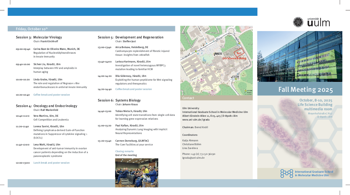 08. Oktober 2025 Fall Meeting 2025 Zeit : Mittwoch , 8. - 10. Oktober 2025 Veranstalter : International Graduate School in Molecular Medicine Ulm Ort :Universität Ulm, Meyerhofstraße, N27, Multimediaraum Frühere Veranstaltung 08. Oktober AcademyDay - Der Beitrag der Uni Ulm zum Quantenfestival Zeit: Mittwoch , 8. Oktober 2025, 9:00 - 17:00 UhrOrt: Stadthaus, Münsterplatz 50, Spätere Veranstaltung 08. Oktober Oleanna - Theater Ulm an der Uni Zeit: Mittwoch , 19:30 UhrVeranstalter: Theater UlmOrt: Universität Ulm, H2