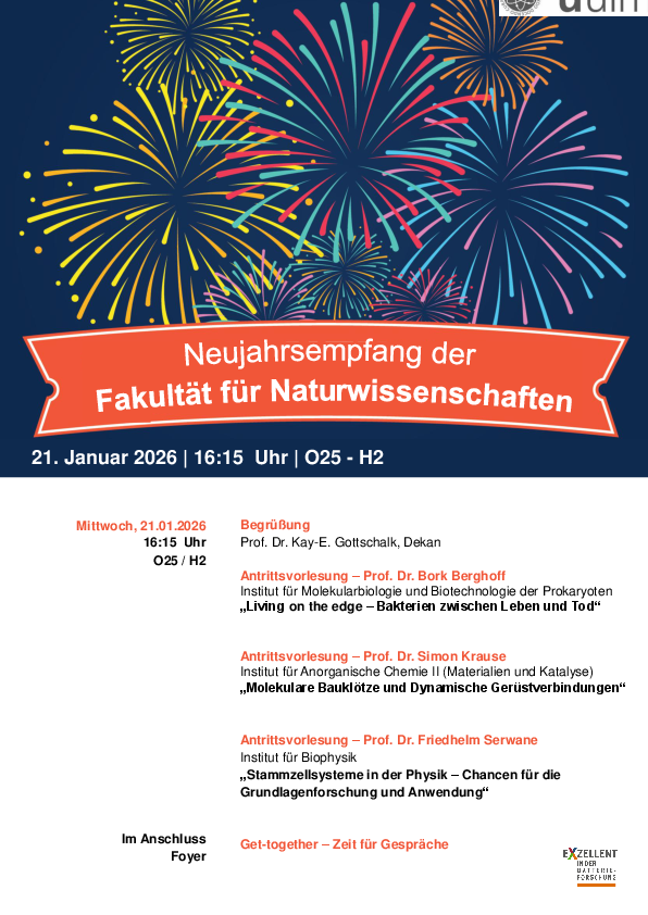 Wir laden Sie im Namen des Dekanats ganz herzlich zum Neujahrsempfang der Fakultät für Naturwissenschaften am 21.01.26 im H2 ein.
