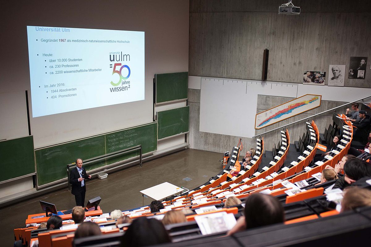 Traditionell wurden die Neulinge – darunter über 120 Ersteinschreiber – vom Universitätspräsidenten Professor Michael Weber begrüßt: „Sie sind an eine gute Universität gekommen: Erst vor zwei Wochen sind wir im THE Young University Ranking wieder zur besten jungen Universität Deutschlands gekürt worden – und zur achtbesten weltweit“, betonte der Informatiker. Im Jubiläumsjahr gehörten über 10 000 Studierende – darunter rund 13 Prozent Ausländer – etwa 230 Professoren und 2200 Wissenschaftliche Mitarbeiter der Universität an. Entgegen aller Prognosen sinke die Studienanfängerzahl von über 3000 pro Jahr an der Uni Ulm nicht.