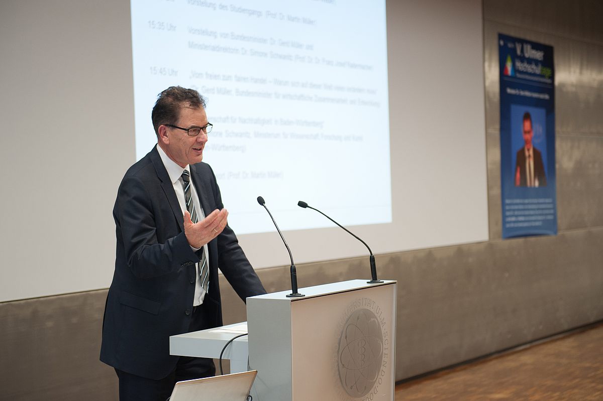 Am Donnerstag wurde der in Süddeutschland einzigartige Masterstudiengang "Nachhaltige Unternehmensführung" an der Uni Ulm offiziell eröffnet. Unter den prominenten Rednern waren der Bundesminister für Entwicklung und Zusammenarbeit, Dr. Gerd Müller, und Ministerialdirektorin Dr. Simone Schwanitz (Ministerium für Wissenschaft, Forschung und Kunst, Baden-Württemberg). Den passenden Rahmen bildeten die fünften Ulmer Hochschultage "Ökosoziale Marktwirtschaft und Nachhaltigkeit".