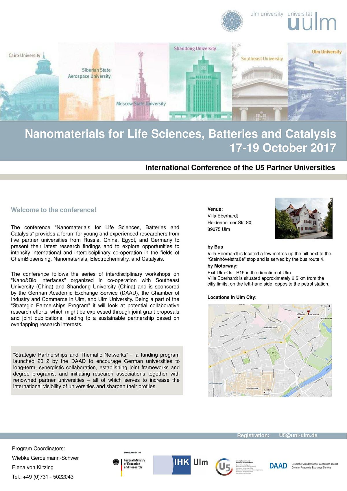 Ihr gemeinsames Interesse gilt Nanomaterialien für Lebenswissenschaften, Batterieforschung und Katalyse. Den Rahmen der dreitägigen Konferenz bildet das DAAD-Programm Strategische Partnerschaften: Seit 2013 fördert das Bundesministerium für Bildung und Forschung (BMBF) den wissenschaftlichen Austausch der Universität Ulm mit der Cairo University in Ägypten sowie mit den chinesischen Partnern Southeast University und Shandong University. Russische Kooperationspartner der Ulmer Universität sind die Lomonossov Moscow State University und die Siberian State Aerospace University. Gemeinsame Forschungsschwerpunkte der so genannten „U5“ umfassen Diabetes und Herz-Kreislauferkrankungen sowie Fragestellungen aus der molekularen Medizin und der Batterieforschung.
